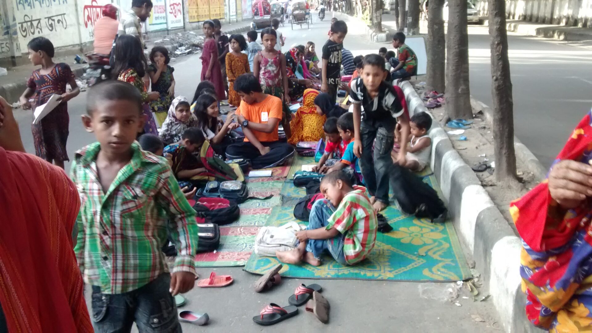 After leaving the railroad tracks, we walk back to Raj, who is trying to turn the car in the heavy traffic. Emran tells him the way, and we drive through the stream of Rickshaws, walking people, street sellers, and cars to another street. There, Emran points to something colourful in the middle of the street, between the traffic. I look closer and see that they are children sitting on mats on the street, while the traffic passes by alongside. Three adults are walking and standing around them, and one is sitting in between them, bend over schoolbooks. We walk over, and Nasir Udden Rubel is coming to us to welcome us to their school, Prothom Surjo. He is the initiator of this project, started to offer complementary education to the public school in the morning, and give these children who live on the street a better education.